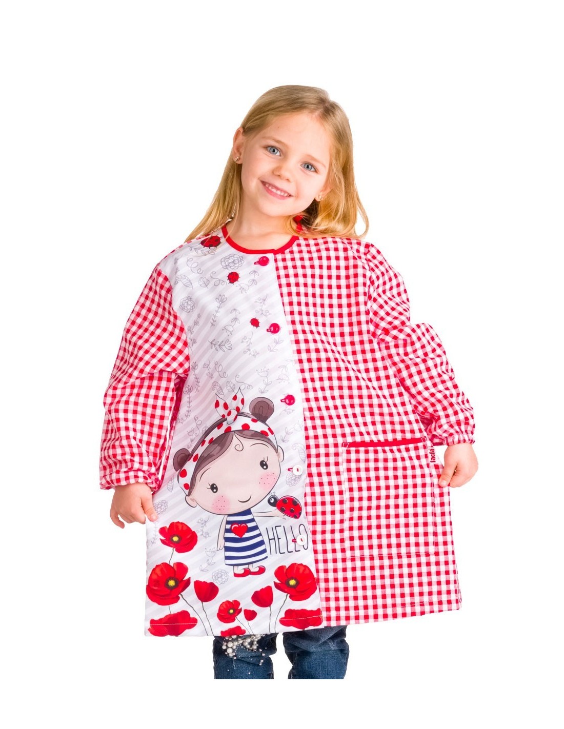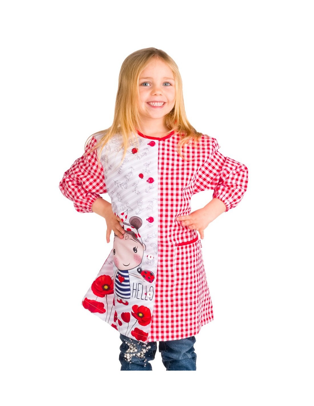 Fuera los babis aburridos. Esta bata escolar es una combinación preciosa del típico tejido de cuadros tradicional y la impresión de un estampado vistoso y colorido. Es una bata infantil muy práctica, pero también es un capricho.